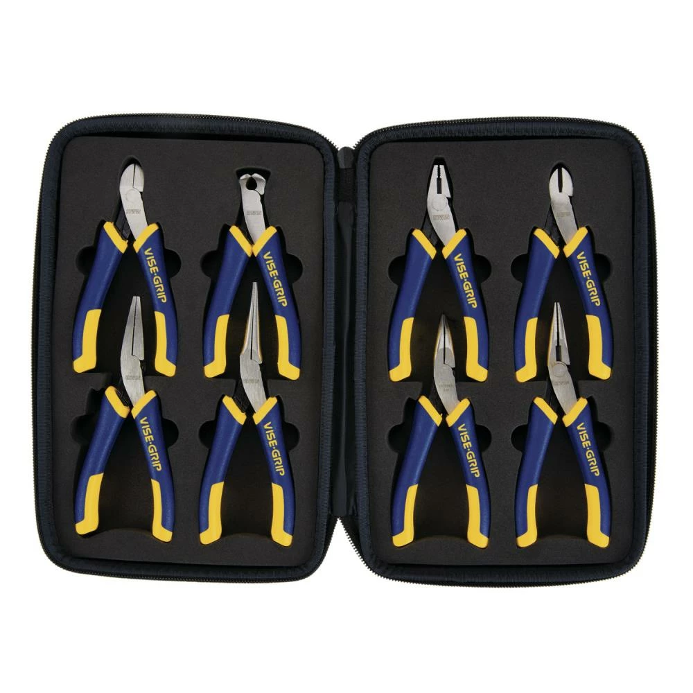 This IRWIN VISE-GRIP Mini 8-piece Pliers Set with Case is made with durable nickel chromium steel and the induction hardened cutting edge will stay sharp, longer. The spring loaded jaw gripping is less tiring and the ProTouch Grips are non-slip, making them comfortable with more control and less hand fatigue. This is a wide variety set VISE-GRIP mini pliers and comes with a convenient storage case. Backed by the IRWIN Lifetime Guarantee.