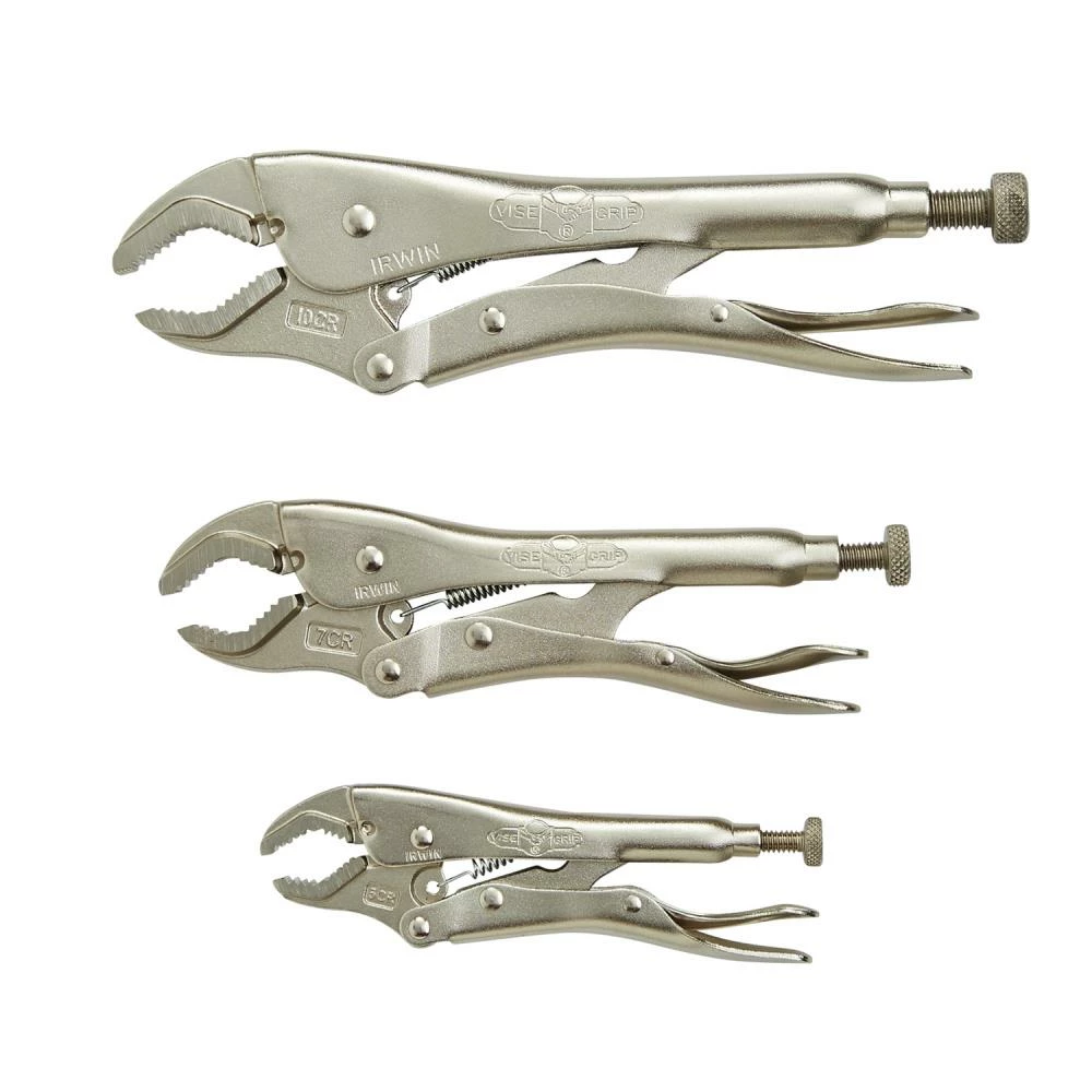 Ideal for tightening, clamping, twisting and turning. Classic trigger release provides maximum locking force. Constructed of high-grade heat-treated alloy steel for maximum toughness and durability. Adjust pressure and work fit with turn screw that stays adjusted for repetitive use. 3-Piece Set in tray includes 10CR, 7CR and 5CR.
