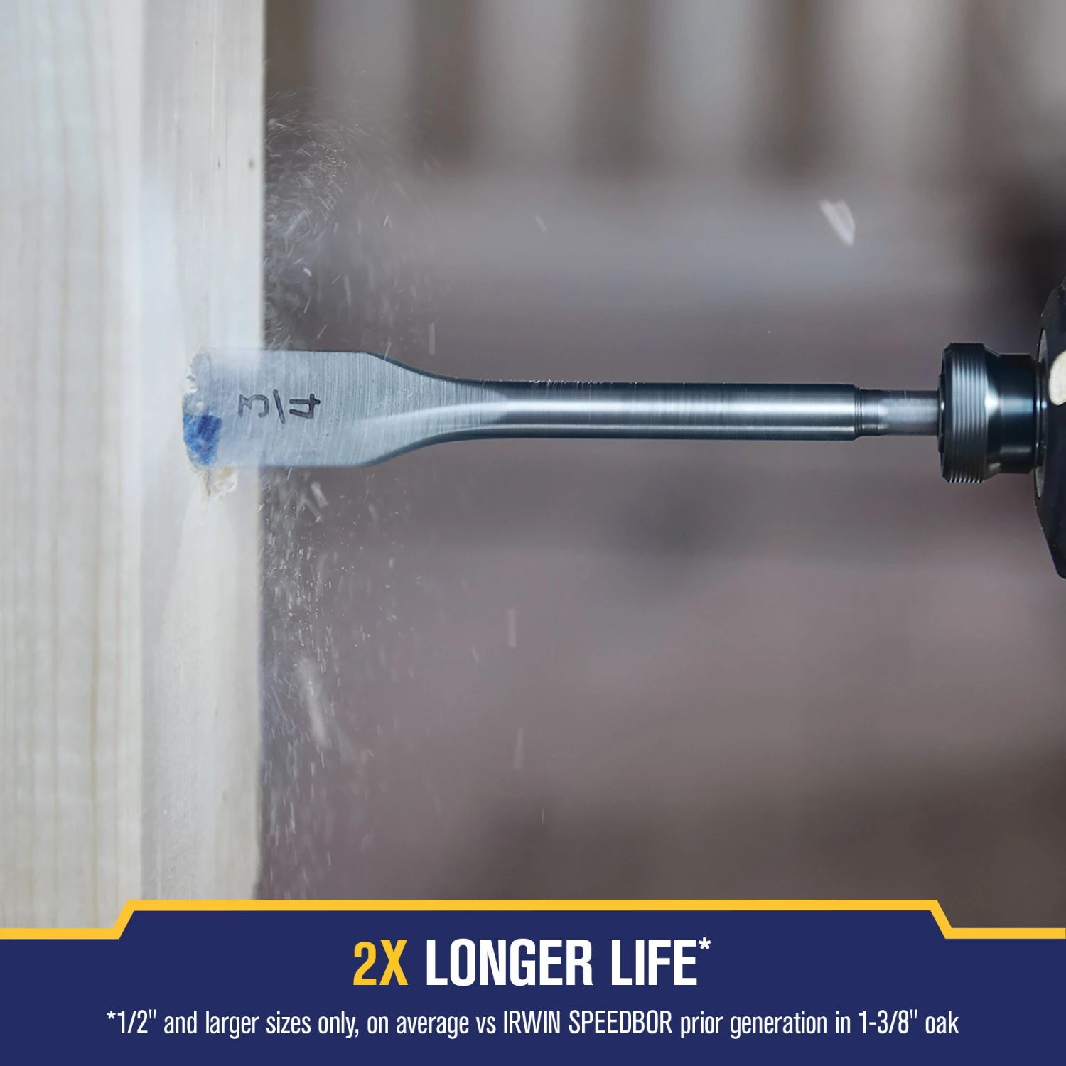 The improved SPEEDBOR Spade Bits now last 2X Longer and cut 2X Faster. Next-generation SPEEDBOR® Spade Bits feature a chamfered cutting edge for durability in cutting wood and optimized point tip that is wider and longer than previous IRWIN spade bits to minimize splintering and control speed. Patented Blue-Groove® cutting edge allows for a large cutting area for aggressive removal of wood chips and fast drilling.